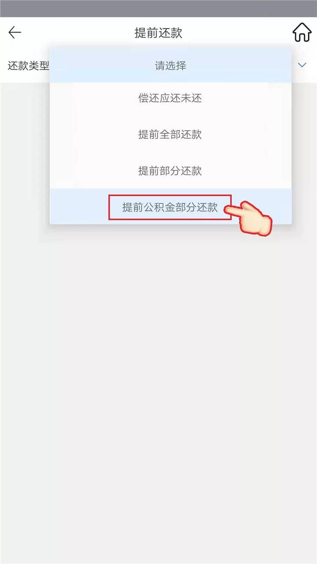 “还款类型”中选择“提前公积金部分还款”,如下图: