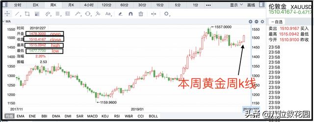 见下图:上周现货黄金的周线图。
