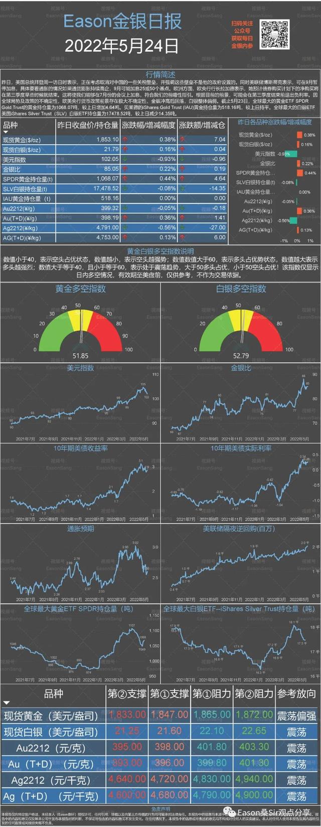昨日,美国总统拜登周一访日时表示,正在考虑取消对中国的一些关税壁垒,并强调这些壁垒不是他的政府设置的。同时美联储博斯蒂克表示,可在9月暂停加息,具体要看通胀的情况如果通货膨胀持续高企,9月可能加息25或50个基点。欧洲方面,欧央行行长拉加德表示,她预计债券购买计划下的净购买将在第三季度早些时候就结束。这将使我们能够在7月份的会议上加息,符合我们的前瞻性指引。根据目前的前景,可能会在第三季度结束前退出负利率。因全球局势及政策的不确定性,欧美央行货币政策前景存在极大不确定性,金银冲高后回落,白银整体偏弱。截止5月23日,全球最大的黄金ETF SPDR Gold Trust的黄金持仓量为1068.07吨,较上日增加4.64吨。贝莱德的iShares Gold Trust (IAU)黄金持仓量为518.16吨,较上日持平。全球最大的白银ETF美国iShares Silver Trust(SLV)白银ETF持仓量为17478.52吨,较上日减少14.35吨。