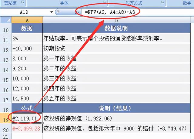Rate 为某一期间的贴现率,是一固定值。Value1, value2, ... 代表支出及收入的 1 到 254 个参数。Value1, value2, ...在时间上必须具有相等间隔,并且都发生在期末。NPV 使用 Value1,Value2, … 的顺序来解释现金流的顺序。所以务必保证支出和收入的数额按正确的顺序输入。如果参数为数值、空白单元格、逻辑值或数字的文本表达式,则都会计算在内;如果参数是错误值或不能转化为数值的文本,则被忽略。如果参数是一个数组或引用,则只计算其中的数字。数组或引用中的空白单元格、逻辑值或文本将被忽略。说明: