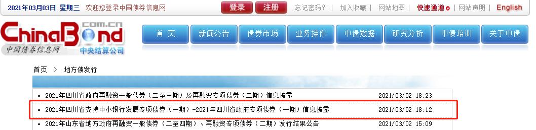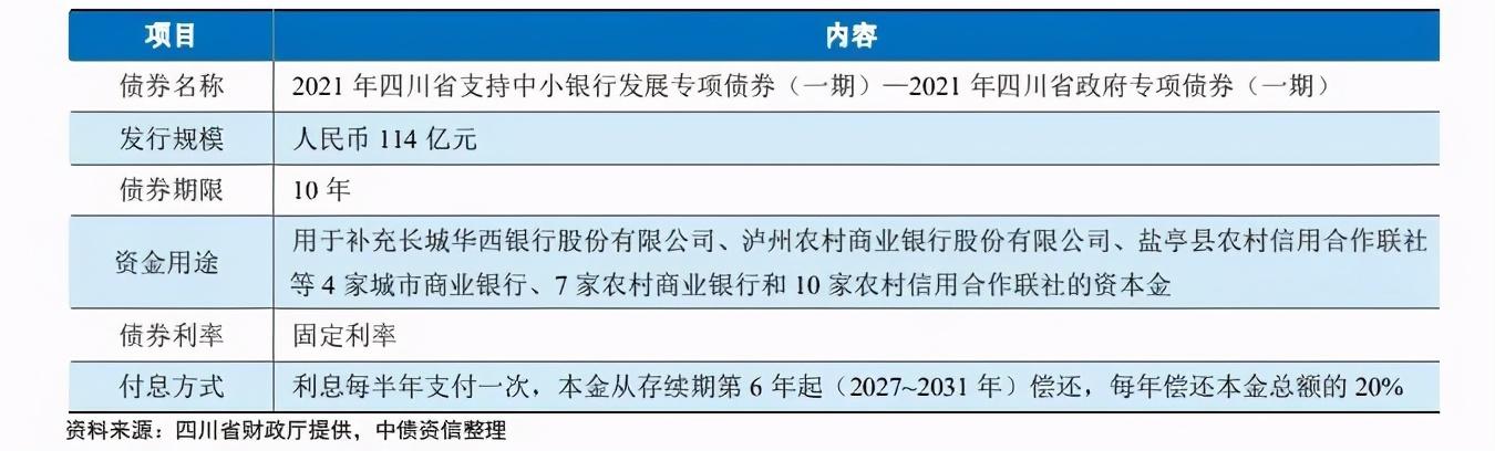 3月2日,2021年首只新增专项债券挂网披露,规模114亿元,专项用于补充四川省内4家城市商业银行、10家农村信用合作联社及7家农村商业银行的资本金。根据四川日报刊登的《关于四川省2020年预算调整方案及1至10月预算执行情况的报告》显示,经国务院批准,2020年11月中旬财政部先行下达四川省支持化解地方中小银行风险新增专项债券额度114亿元。本次发行后四川支持化解地方中小银行风险新增专项债券额度114亿元使用完毕。