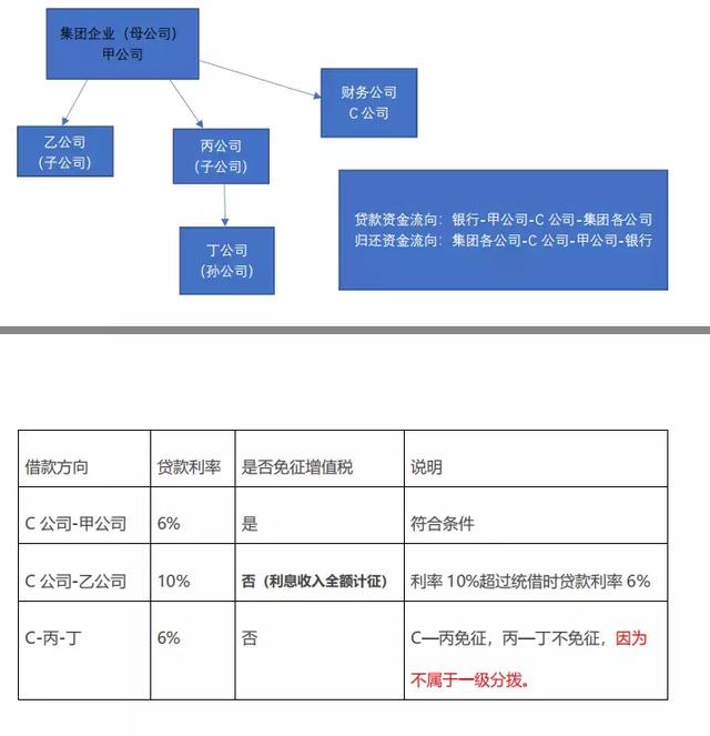 财税(2016)年 36 号文规定:统借统还业务中,企业集团或企业集团中的核心企业以及集团所属财务公司按不高于支付给金融机构的借款利率水平或者支付的债券票面利率水平,向企业集团或者集团内下属单位收取的利息免征增值税。统借方向资金使用单位收取的利息,高于支付给金融机构借款利率水平或者支付的债券票面利率水平的,应全额缴纳增值税。