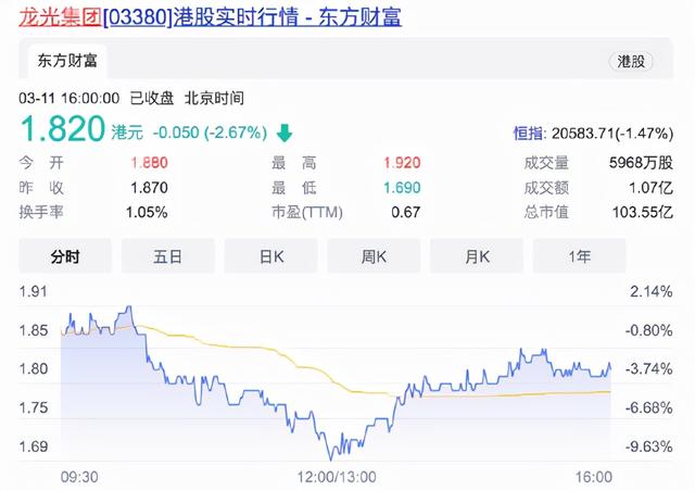 事实上,今年以来龙光集团股价跌幅较大,年内跌幅近70%,市值蒸发近235亿港元。截至3月11日港股收盘,龙光集团股价为1.820港元/股,跌幅为2.67%,总市值为103.55亿港元。