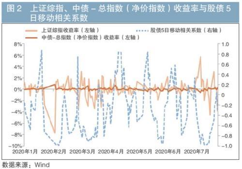 笔者通过分析发现,2020年股债跷跷板效应在多个时段显现,仅个别时段失效,分别是1月15—20日、2月27日、3月20日、4月7—17日、5月7—13日、6月2—10日、6月30日。我国股债跷跷板效应相对较强(股债5日移动相关系数小于-0.5)的主要时段分别为1月23日—2月10日、2月17—24日、2月28日—3月19日、5月18—28日、6月16—19日、7月3—17日(见图2)。从波动率来看,上证综指收益率波动较大,中债-总指数(净价指数)收益率波动较小,前者的波动方差是后者的67倍。