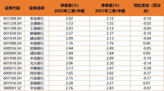 净息差同比数据下降外,银行业环比数据表现也不及预期。据银保监会数据显示,今年二季度商业银行净息差为1.94%,较一季度继续收窄3bp;一季度商业银行净息差为1.97%,较2021年全年的2.08%下降0.11个百分点。