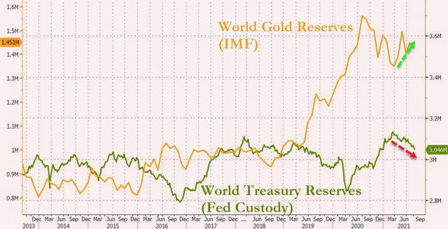 正是这些背景下,一些聪明的国际资金已经提前开始从美国资产市场中转移出来,最新的数据正在反馈这个趋势,这些资金纷纷涌入在通胀上升情况下会有上佳表现的战略资产,比如黄金,正如下面这张由世界黄金协会和IMF提供的最新数据所示,我们注意到最近几个月从美国债券到黄金的置换趋势仍在继续,这背后的原因很简单。