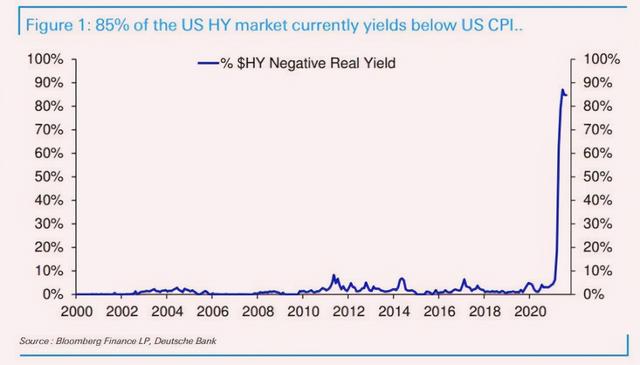 因为,美国长期将利率保持在零水平,且通胀维持在5%以上的高位,导致美债收益率扣除月度通胀后连续27周出现负收益,随着通胀和物价激增并持续处于高位后,帮助美国减轻了债务负担,使得美债违约的风险增加,据德银高级分析师吉姆·里德 (Jim Reid) 的报告,目前,美国债券市场中有85%的高收益债券实际收益率为负值,低于当前的通胀率。