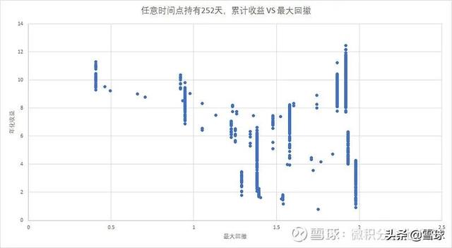 如果是持有252天的累计收益VS最大回撤,可以看到最大回撤基本能够控制住,但是累计收益会下降很多。