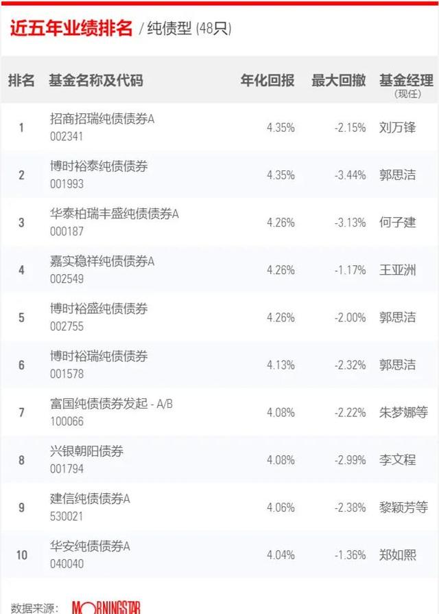最新Morningstar晨星中国5年期债券型基金业绩排行榜如下: