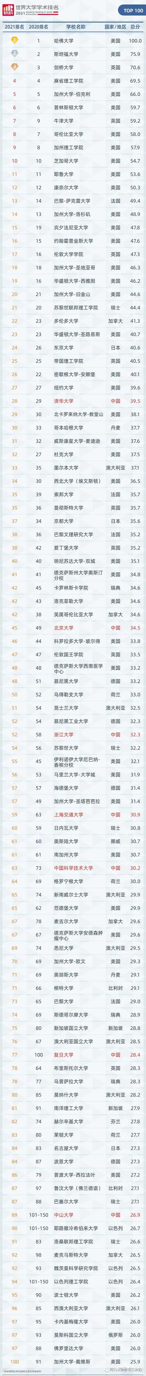对榜单进行细化梳理,我们发现,国内上榜的大学中,清华大学和北京大学均入选了四大榜单的TOP50大学,复旦、浙大、上海交大和中国科学技术大学,位列TOP50-100名单。