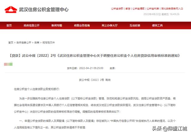 4月21日,武汉住房公积金管理中心发布武公中规【2022】2号《武汉住房公积金管理中心关于调整住房公积金个人住房贷款信用审核标准的通知》(下文简称《通知》),对公积金贷款的信用审核标准进行了调整,文件内容即时生效,有效期5 年。