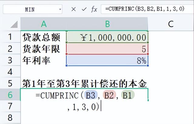例如,要计算第1年至第3年需要偿还贷款为100万元、年利率为8%,年限为5年的本金。