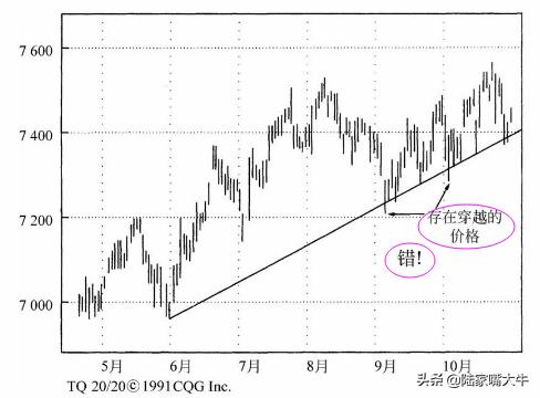 在分析趋势时,趋势线是最有用的工具。不论业余或专业的市场玩家经常会犯一个严重的错误:趋势线的定义与绘制,在方法上缺乏一致性。若希望趋势线能够发挥作用,必须精确反映趋势的定义。我设计的方法非常简单,而且具有一致性。它同时符合道氏理论中对趋势的定义,以及该理论对趋势变动的推论: