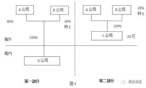 根据《公告》,非居民企业通过实施不具有合理商业目的的安排,间接转让中国居民企业股权,可以重新定性该间接转让交易,确认为直接转让中国居民企业股权。笔者认为,根据《公告》,可以把例3的图3拆解为图4中的第一部分和第二部分,第一部分为A公司和B公司直接持有境内D公司,第二部分为A公司和B公司直接持有中间层C公司,B公司再分别把境内D公司和境外C公司20%股权转让给E公司,具体见图4。