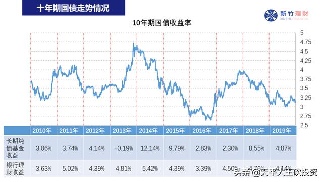 2013年底,市场利率由升转降,在降息通道下2014年长期纯债收益率高达12.14%,完胜银行理财4.81%的平均收益率。2016年长期纯债基金的收益只有2.83%,这个收益表现也是略逊色于当年银行理财3.39%收益的;
