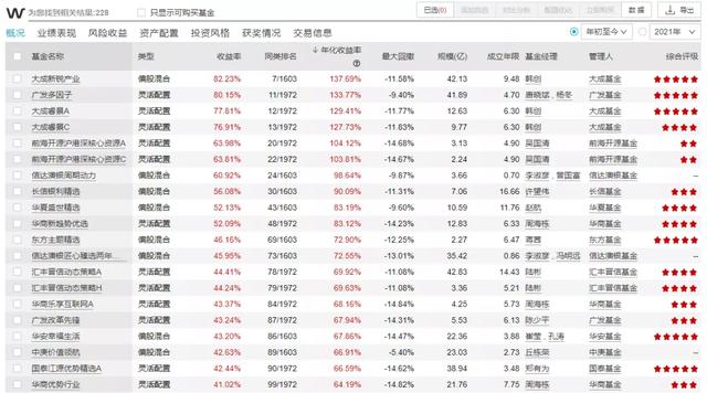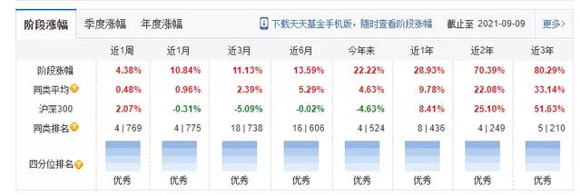 就拿第一只基金来看,截止到2021.9.9今年以来涨幅82.23%同期沪深300是跌了4.63%同类排名第7。同时近1年、近2年、近3年业绩也都优秀。这点可以初步判断长期也不错。