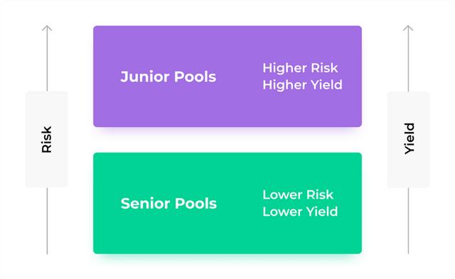 Senior Pool(sBONDs)——在系统内具有优先分配收益权,锁定固定利率收益,也被俗称为「老人池」。Junior Pool (jTokens)——剩余收益分配权,所获得的收益为支付同一系统内Senior Pool固定收益后的剩余资产,收益不固定,具有波动性,被俗称为「小孩池」。Junior Pool和Senior Bond两种收益产品特点