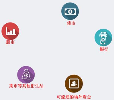 目前来说,资本市场的主要资金可以分为五个方面,即股市的钱(买入股票的资金)、债市的钱(买入债券的资金)、银行的钱(进行储蓄的资金)、期市即其他衍生品的钱(买入期货等衍生品的资金)和随时准备入场的钱(投资人手里的暂时闲置的、有意愿流入其他四个市场的资金)。