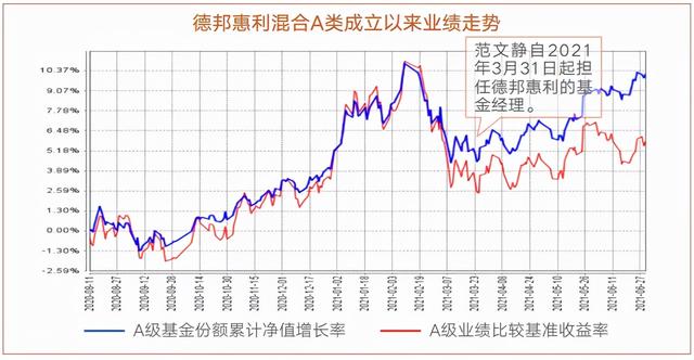 德邦惠利混合于2020年8月11日成立,2020年A类5.24%/5.10%,C类5.0%/5.10%,2021年上半年A类4.75%/0.70%,C类4.74%/0.70%,成立以来A类10.24%/5.83%,C类10.19%/5.83%。范文静管理的同类型基金德邦稳盈增长于2017年3月10成立,范文静自2021年3月31日起担任德邦稳盈增长的基金经理,2017年8.02%/8.95%,2018年-30.64%/-9.62%,2019年27.84%/19.92%,2020年21.20%/15.20%,2021年上半年2.89%/1.47%,成立以来19.44%/38.03%。