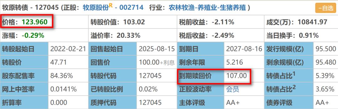 到期赎回价的意思是我们持有的可转债到期时可以拿回的价格,目前牧原转债的到期赎回价是107元,如果我们买入的可转债价格非常接近107元,差不多就能实现保底的作用了。