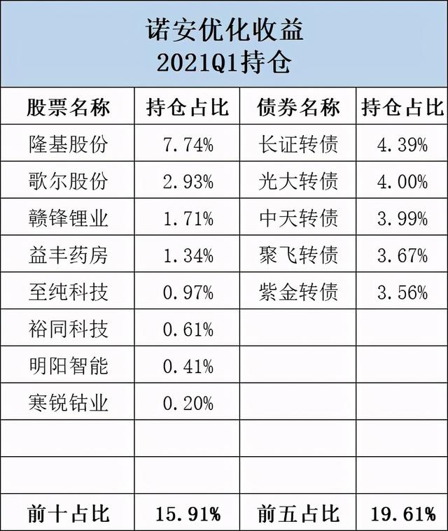 下图为2021年一季报持仓情况,股票以新能源 科技为主,可转债占比84.9%。