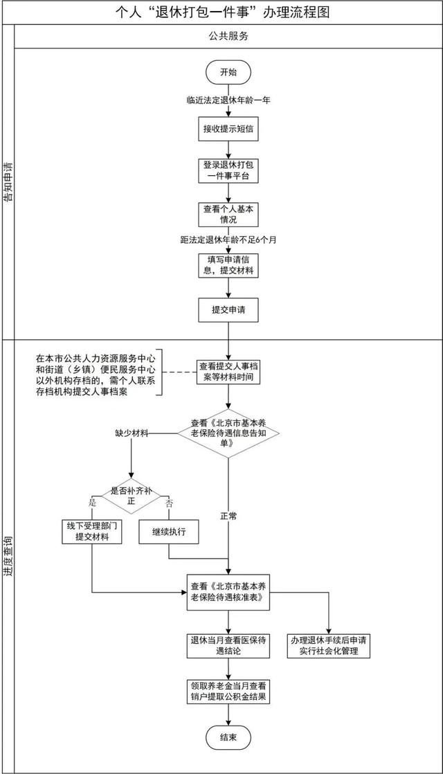 距法定退休年龄还有6个月的参保人,个人和参保单位均可登录北京市人力资源和社会保障局官方网站、或北京市政务服务网“办好一件事”专区,通过两种渠道都可以进入“退休打包一件事”平台(http://fuwu.rsj.beijing.gov.cn/bjdkhy/zgtx/)按提示操作提交申请。具体申报情况主要分为两类:由参保单位申请和参保人申请。