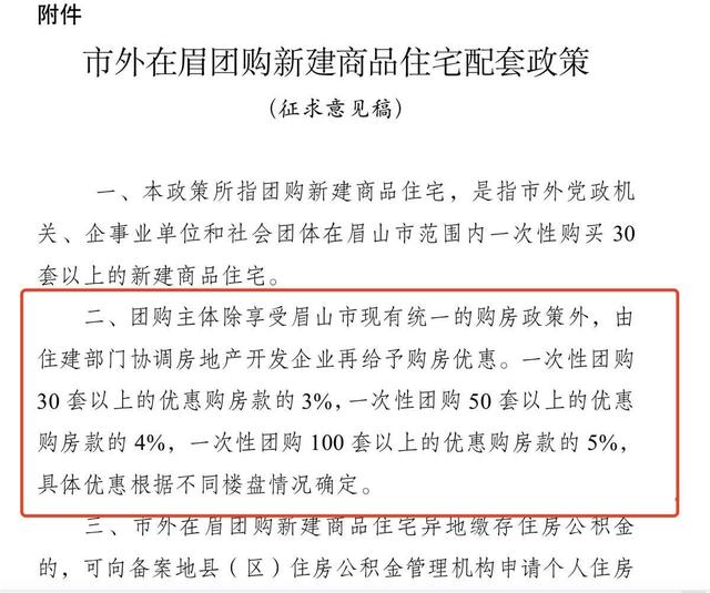 不过该政策所指团购新建商品住宅,是指市外党政机关、企事业单位和社会团体在眉山市范围内一次性购买30套以上的新建商品住宅。团购主体除享受眉山市现有统一的购房政策外,由住建部门协调房地产开发企业再给予购房优惠。