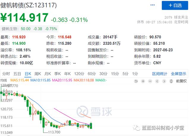 例如健帆转债,2021/7/12上市,上市收盘价为125.5元,此后最高收盘价也仅是125.6元,便一路走低至当下的114.917元