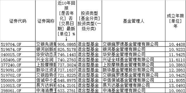 十年前买入并持有后,从图四可以看到最强基金就是交易施罗德的交银先进制造业(519704),也就是到现在你最多可以拿到9倍的收益。