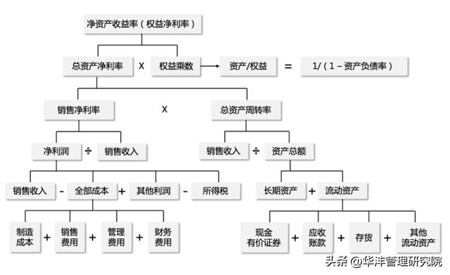 企业财务指标发展到今天,已经形成了非常严谨的指标体系,这为企业思考和确定财务指标奠定了逻辑基础。比如著名的杜邦分析法,就系统清晰地给出了企业财务指标之间的逻辑关系,如下图所示: