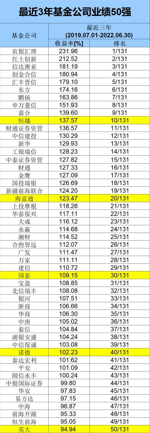 海通证券数据显示,从3年期(2019年7月1日到2022年6月31日)绝对收益排名看,三年期冠军为农银汇理,旗下权益类基金平均收益超过231.96%,在131家公司中排名第一。紧随其后的是红土创新,旗下权益类基金平均收益超过200%,率达到212.52%,显然踏准了市场的节奏。