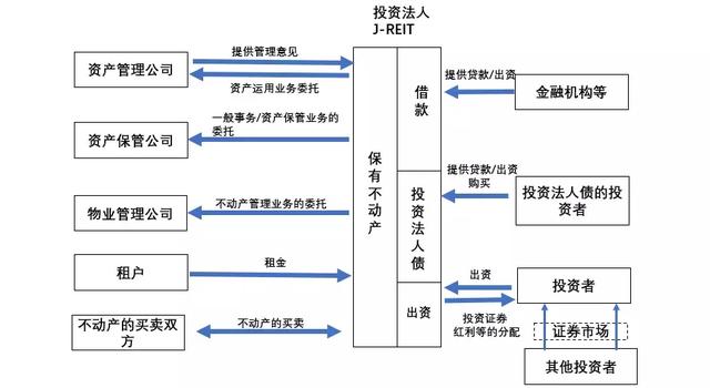 根据投信法之规定,以运用从投资者处募集而来的资金为目的而设立的法人组织称之为投资法人。投资法人比较类似于国内的公募基金的形式,但又有所不同。这体现在国内的公募基金是证券投资基金,投资对象为有价证券。而日本的投资法人的投资对象除了有价证券以外还包括了不动产。J-REITs采用的是投资法人的方式,(即以公开上市发行”投资口”相当于公司股票)、发行公司债的方式筹集资金,投资法人结构在满足一定的条件下,也可实现股东分红的税前抵扣而回避双重征税。