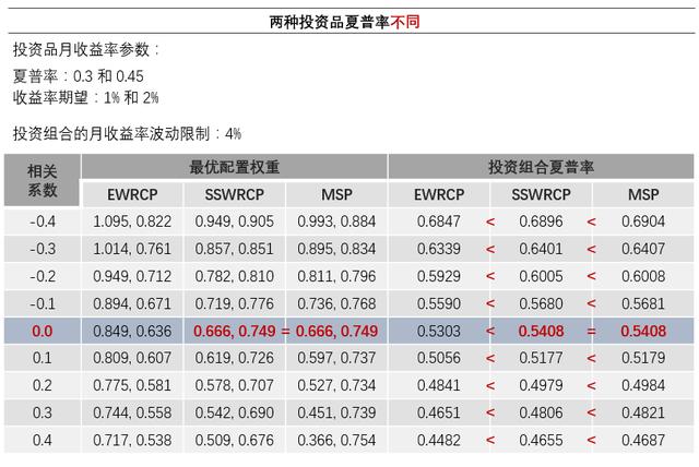 当夏普率不同时,如果投资品独立,则有 MSP 和 SSWRCP 等价,且它们都优于原始的 EWRCP;如果这两个投资品相关,则 MSP 的最优资产配置权重优于 SSWRCP,而 SSWRCP 则又优于 EWRCP。此外,无论夏普率是否相同,EWRCP 求解出的最优资产配置权重和这两个投资品各自的波动率成反比。