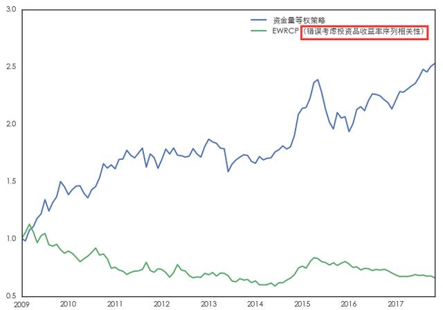 首先,我们来看错误考虑收益率之间序列相关性的情况,即我们把收益率的协方差矩阵直接带入到 EWRCP 模型中。为了比较,我们使用资金等权的配置作为基准(通过杠杆把两个组合的月收益率的波动率控制在 4%)。这两种方法都是按月再平衡,它们的最优资产配置权重及对应的投资组合效果如下所示。