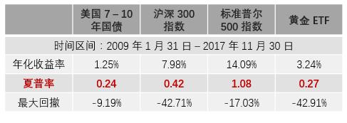 6 实证本节通过一个简单的实证说明正确和错误的使用 EWRCP 模型将产生千差万别的影响。考虑四个代表性的投资品:美国 7 – 10 年国债(IEF)、沪深 300 指数(A)、标普 500 指数(SPX)以及黄金(GLD)。实证的时间区间为 2009 年 1 月 31 日至 2017 年 11 月 30 日。这段时间内这些投资品的风险收益情况如下表和下图所示。