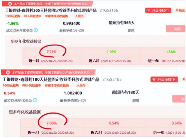 以工银理财鑫鼎利固收增强1个月定开1号产品为例,近1个月该产品年化收益率达6.41%,而最近6个月年化收益率仅为1.84%。