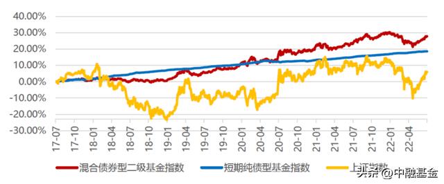 以“固收 ”典型代表——混合债券型二级基金指数来看。近五年,混合债券型二级基金指数的预期收益高于纯债债基指数,净值波动小于上证指数。相较纯债债基更具进攻性、有机会增厚收益;相较上证指数,风险波动较小,回撤较低。