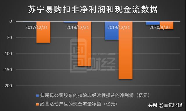 业绩持续亏损 现金流承压根据苏宁易购近三年披露的年报和2020年的三季度季报,公司经营活动产生的净现金流和同期的公司扣非净利润持续为负。