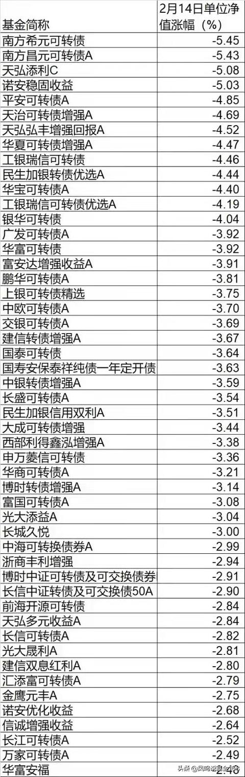 昨天2月14日,情人节,也是情人“劫”,权益类(股基)基金没跌多少,但很多债基却实实在在地领了一碗大面,特别是重仓可转债的债基。看下图就一目了然了。