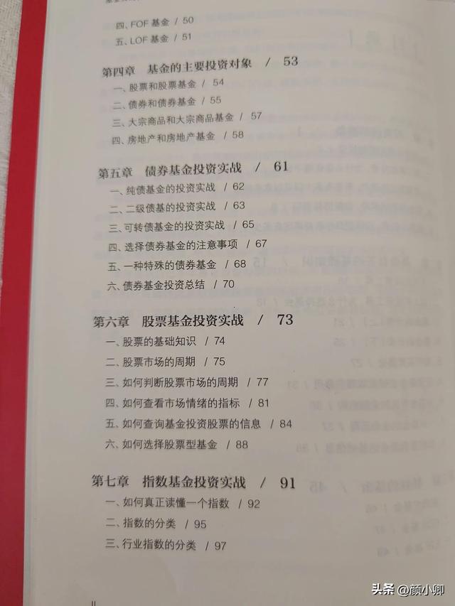 这本书一共10个章节,前4章节介绍基金的基本知识,比如投资之前的准备、基金的基础知识、几类特殊基金以及基金的主要投资对象,帮助我们对基金有个大概的了解,我们要把真金白银投进去,肯定要知道把资金放到哪了。