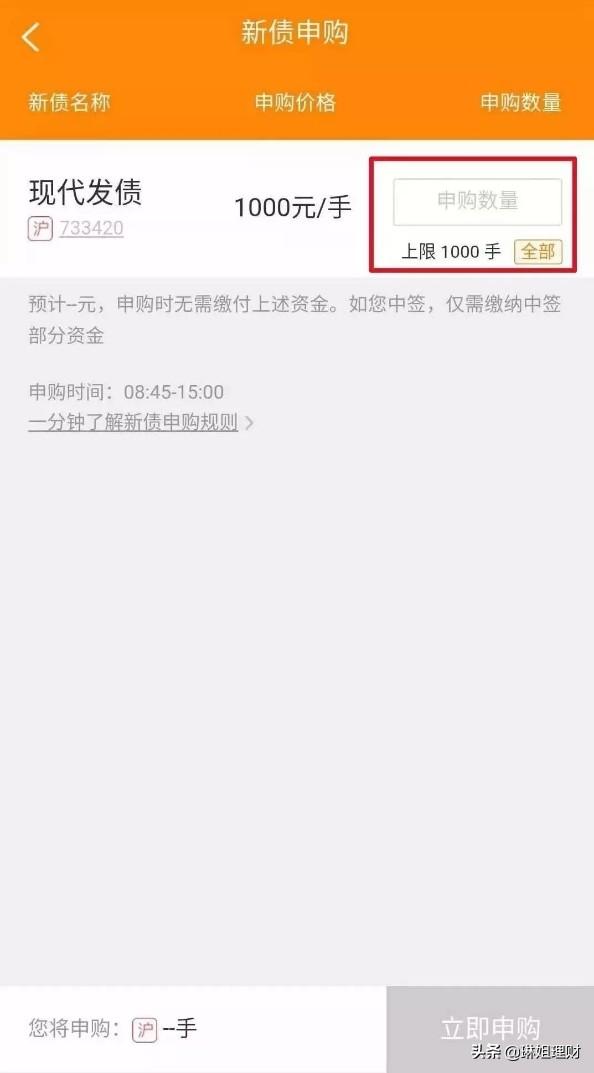 像这张图,现代发债,1000元/手,申购数量就填写最大值,很多朋友会想,那我要是都中了,一次要拿出好多万,超过承受范围之内。