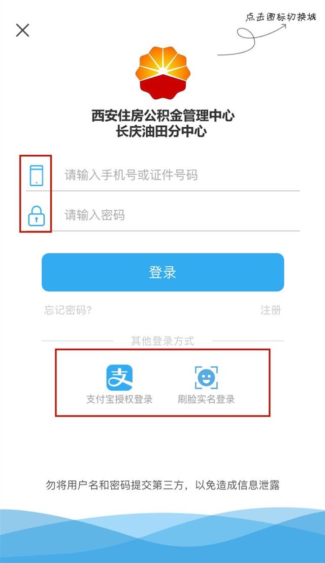 下载后,打开“手机公积金”APP,选择“西安住房公积金管理中心长庆油田分中心”后进入APP登录界面。