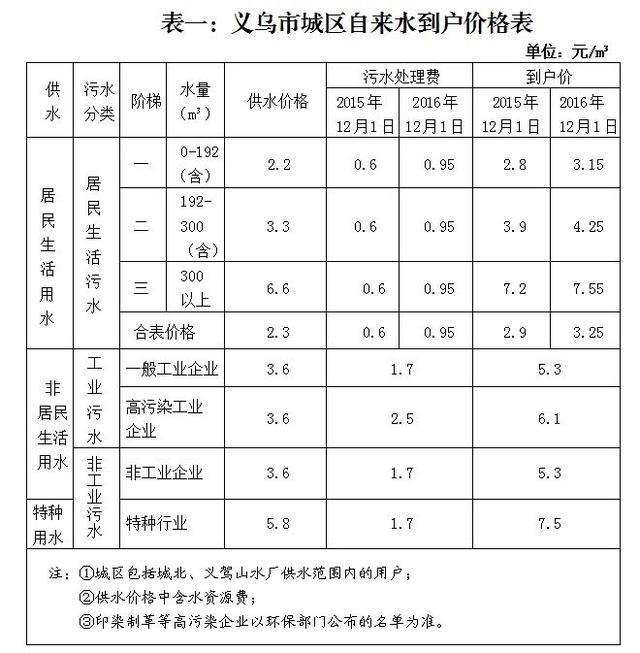 答:义乌市城区居民用水收费标准根据义发改〔2015〕71号文件的要求执行,实行居民生活用水分阶梯价格与合表价格。具体价格表如下: