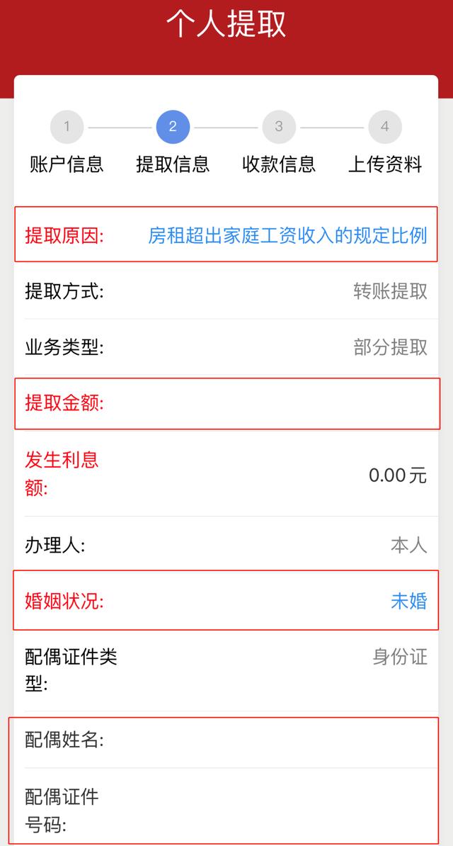 第二步:在提取原因处选择“房租超出家庭工资收入的规定比例”;