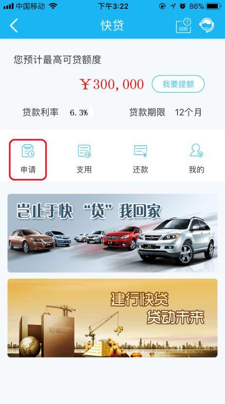 (三)查询成功,点击“确定”后自动返回快贷主界面,可见“最高可贷额度”已更新。点击“申请”继续完成快贷申请。