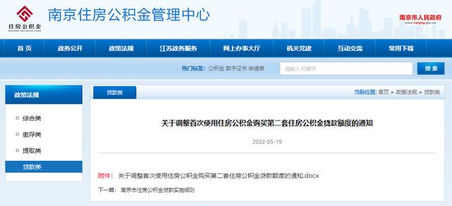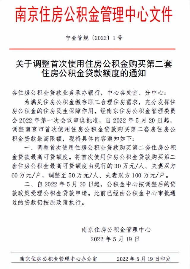 5月19日,南京住房公积金管理中心发布了《关于调整首次使用住房公积金购买第二套住房公积金贷款额度的通知》,并于5月20日执行。