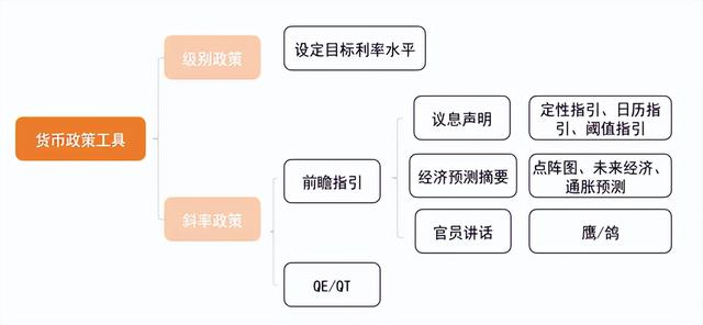 货币政策工具箱包括级别政策与斜率政策。级别政策指传统的美联储货币政策工具,即每次议息会议对目标利率的直接调整;斜率政策包括前瞻指引(议息声明、SEP、美联储官员讲话)与大规模资产购买(LSAP),影响长期利率、远期利率以及未来货币政策路径预期,体现为期限结构(长短利差)的变化。