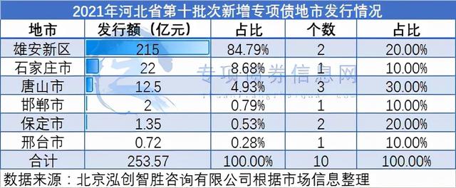 河北省本批次新增专项债券共10个项目,共涉及5个地级市及雄安新区,其中发行金额排名前三的是雄安新区215亿元,石家庄市22亿元,唐山市12.5亿元。
