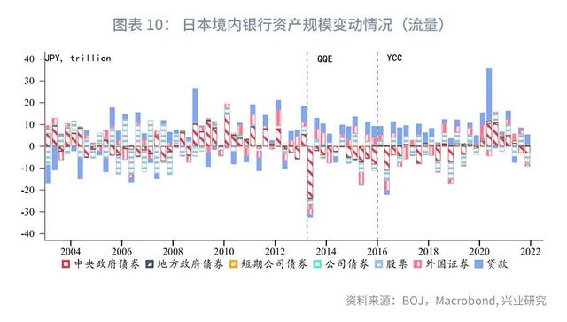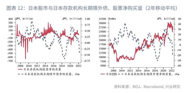 从存款机构的资产结构来看,日本境内银行对外国证券的投资行为还取决于其拥有的其他敞口的变动。日本境内银行的头寸中,外国证券仅占一小部分,其资产还分布于日本中央及地方政府债券、公司债券、股票及贷款等类别,其中贷款和中央政府债券占据主要份额。2016年1月日本央行收益率曲线控制政策(YieldCurve Control,YCC)出台之前,因商业银行持有大量日本国债敞口,国内债券收益率波动较美债收益率对资产结构的影响更大,且在日本债券收益率快速上行的时期,商业银行有可能会选择抛售其余资产以弥补日本国债的持仓损失(2013年第二季度对外国证券的抛售行为便是典型的例子)。日本央行于2013年引入日版量化宽松政策(Quantitativeand Qualitative Monetary Easing,QQE)后,因其加大了国债的购买力度,国内的低利率环境迫使银行抛售本国国债从而寻求其他高回报类型资产,自此外国证券投资占比及头寸调整幅度较此前有所提升。2016年1月以来,因央行对10Y日本收益率的锚定,本国国债敞口调整需求降低,且随着外国证券份额的提升,美债收益率、美股的波动逐渐成为影响存款机构对外证券投资的主要因素(见图表11、图表13)。我们还可以发现,除危机阶段,日本境内银行倾向于以外国证券、国债等资产调仓抄底股市。此外,在金融危机及疫情危机爆发之际,日本存款机构会将资金从外国证券、股票等市场转入本国国债等安全资产,同时加强信贷投放保障流动性。
