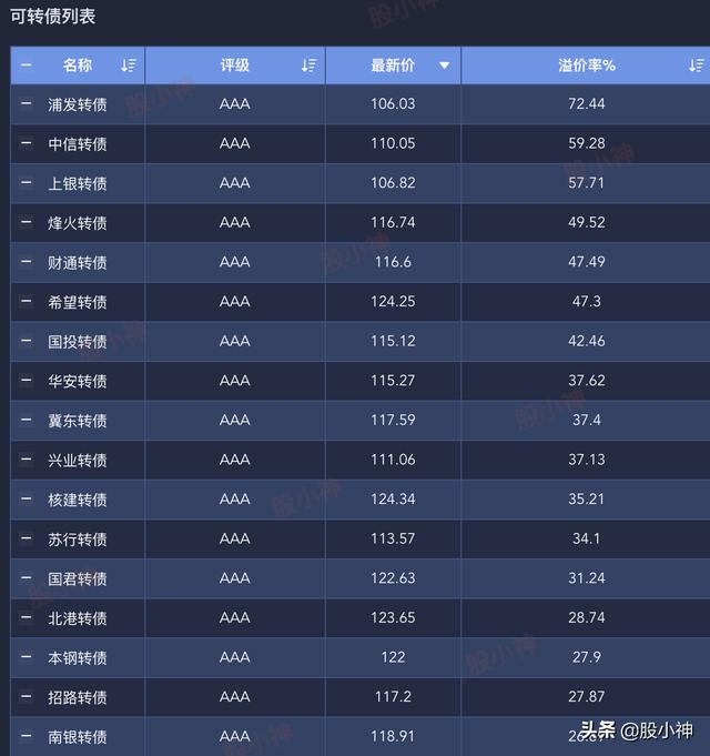 浦发转债,溢价率高达72.44%,最新价只有可怜的106.03中信转债,溢价率59.28%,最新价只有110.05上银转债,溢价率57.71%,最新价只有106.82可转债打新,你还看评级吗?